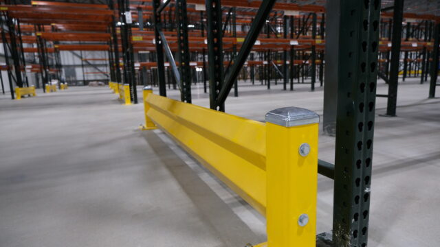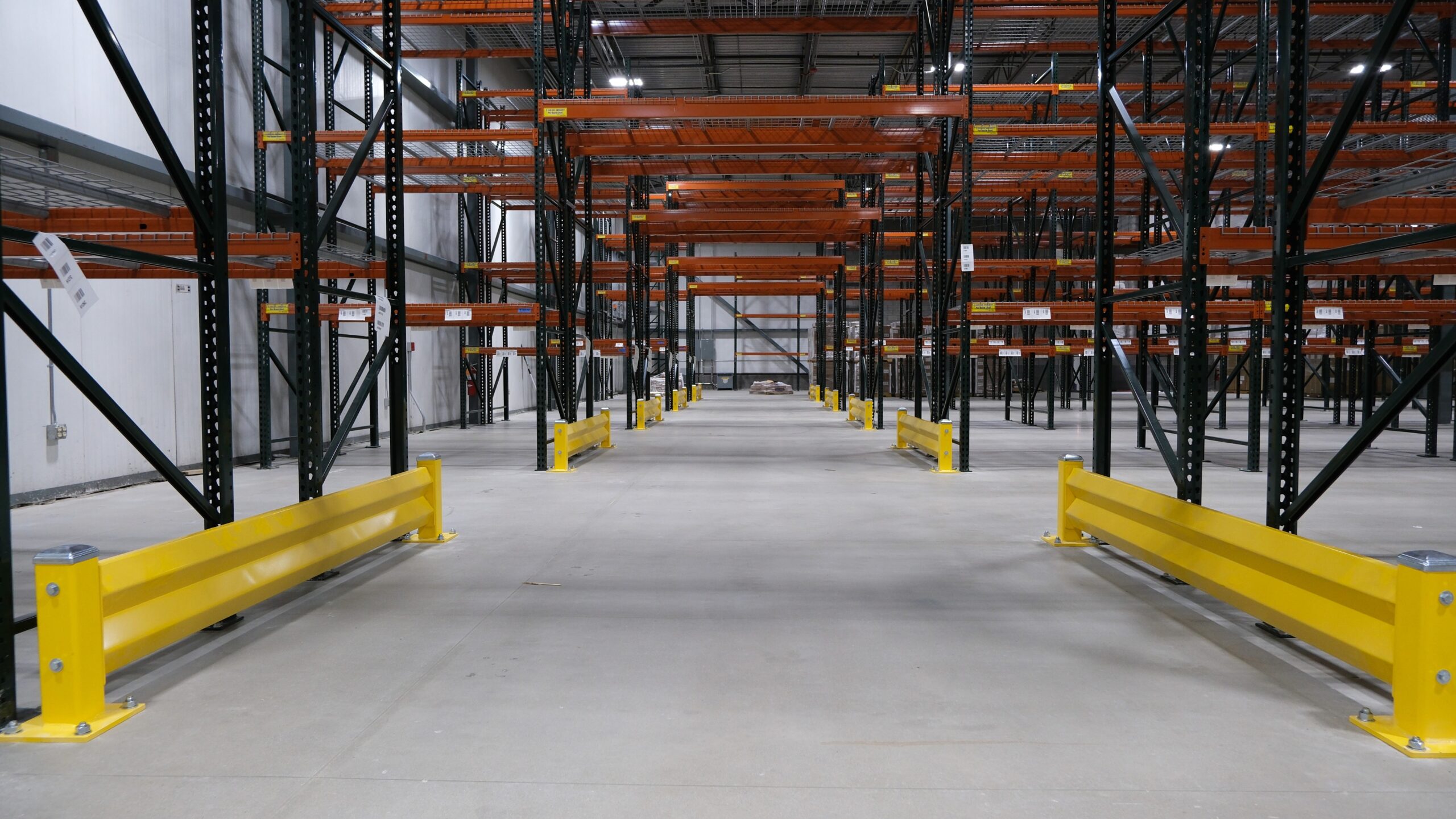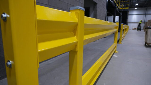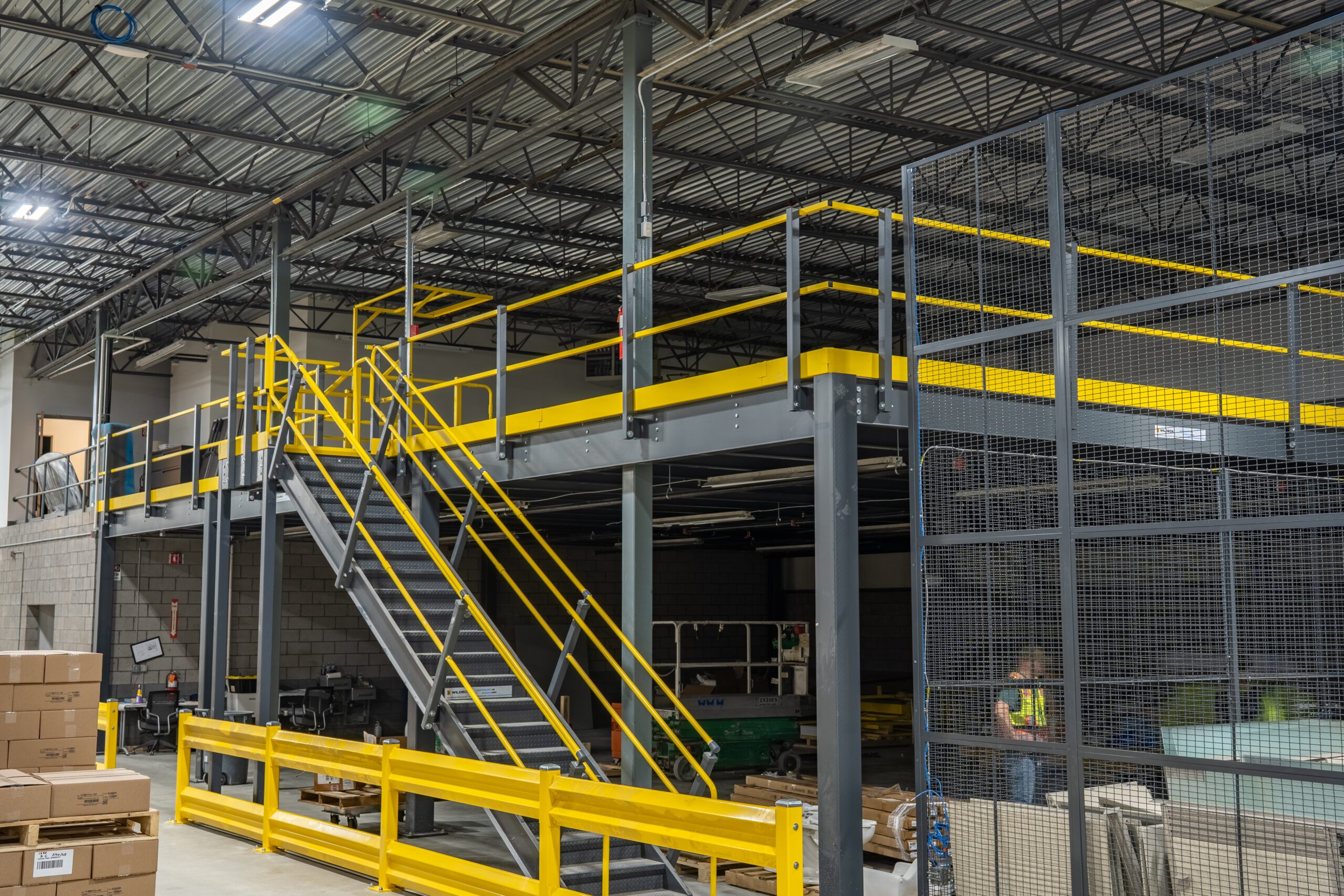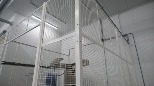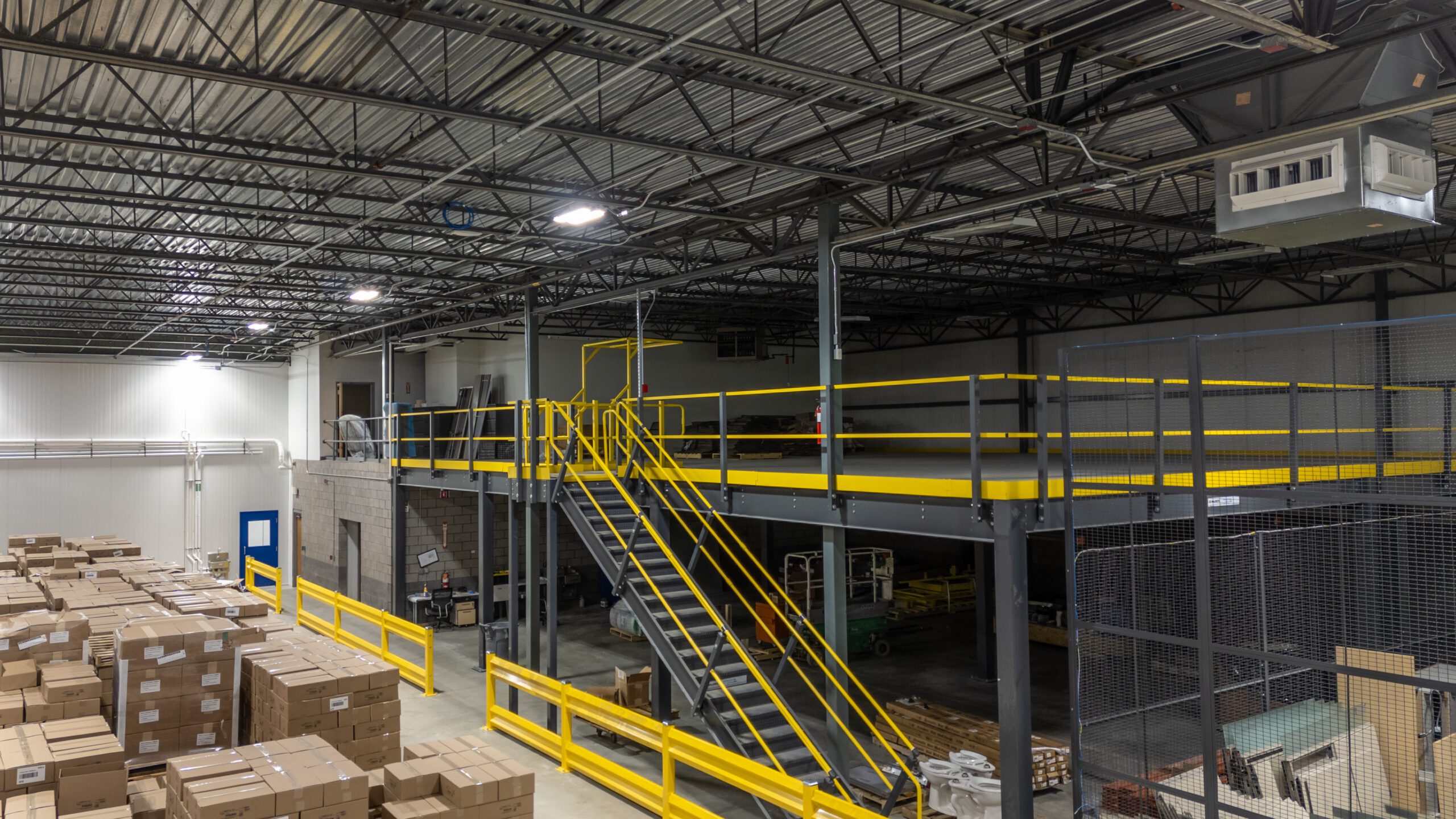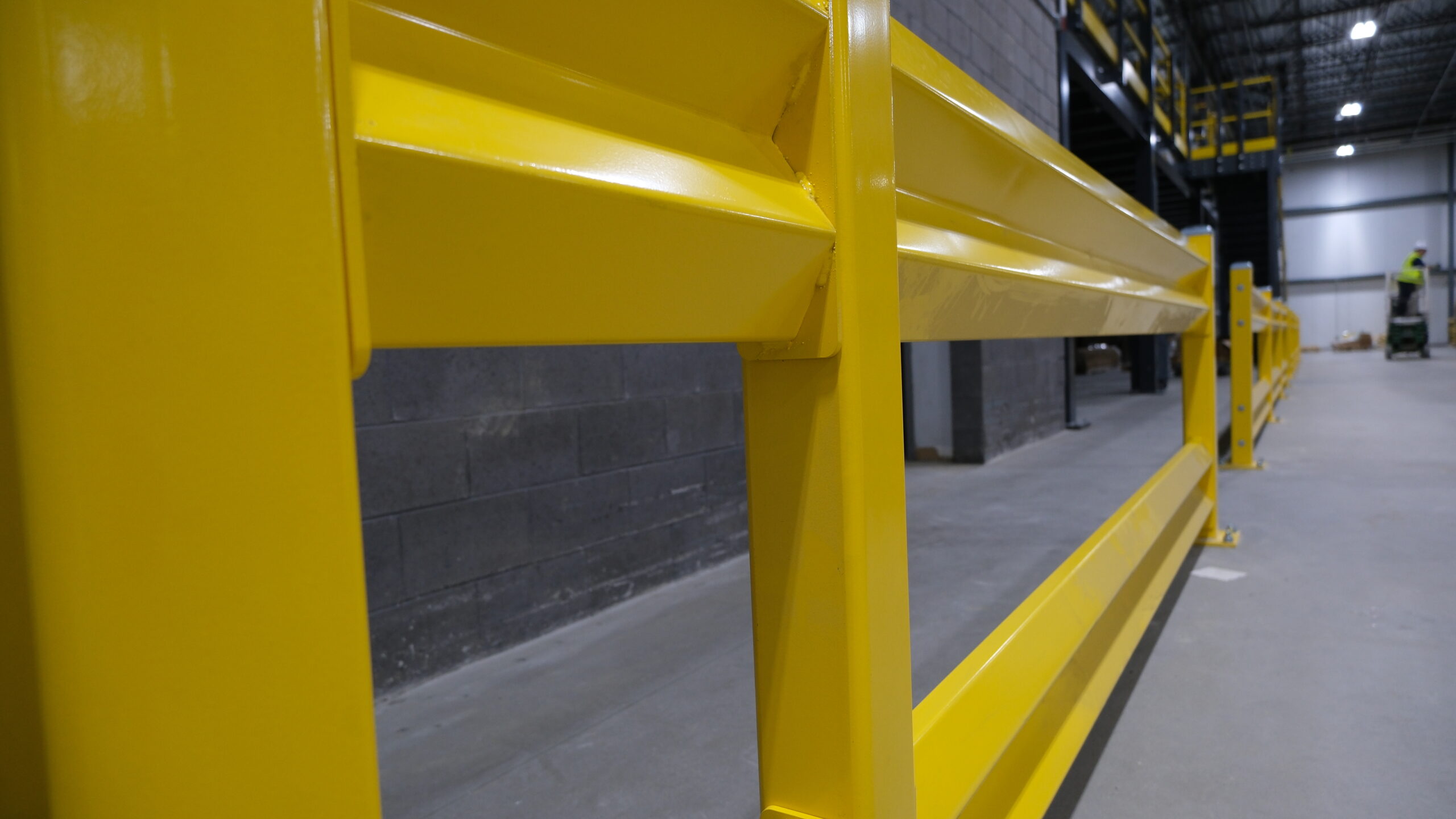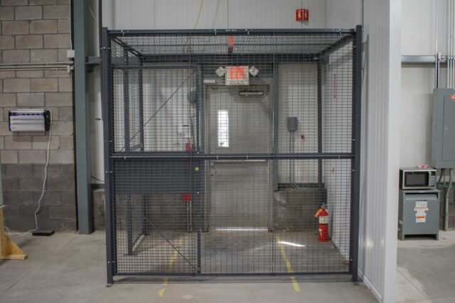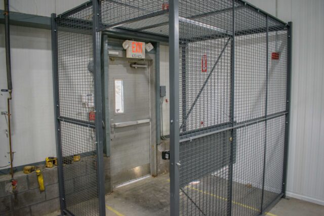 As the client prepared to move into their new facility, they needed a range of solutions that would provide immediate and long-term security, separation, and protection throughout the space. During the installation phase, temporary driver cages were used to manage the constant flow of contractors, technicians, and workers entering and exiting the building. These cages helped secure the facility during construction and setup, ensuring safety and controlled access until the project was complete. Once the external crews were no longer on site, the temporary cages were removed, and permanent solutions were implemented. Two WireCrafters’ partitions, one white and one gray, were installed to serve different functions within the operation. The white partition houses equipment and machinery near production areas, while the gray partition secures storage near the pallet racking and mezzanine. Additionally, WireCrafters’ guardrail was installed to protect both the mezzanine and racking systems from potential equipment impact, further enhancing safety and efficiency within the new facility.