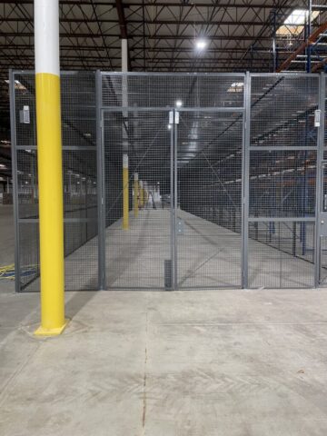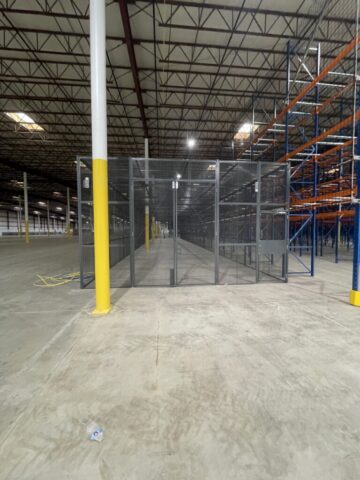 The grocery outlet needed a secure storage solution for aerosol cans that would meet fire and safety code requirements. Because aerosol products must be stored in a contained area, the facility required an enclosure that could safely separate the inventory while still allowing efficient daily operations. The design also needed to include double doors that would remain open during normal use to allow forklift access but automatically close in the event of a fire. To meet these requirements, Eastern Lift Truck and WireCrafters developed a cost-effective wire partition solution that provided the necessary containment without disrupting workflow. The Eastern Lift Truck installation team successfully assembled the complex ceiling and enclosure, resulting in a clean, professional finished system that passed final inspection and met both the facility’s safety and operational needs.