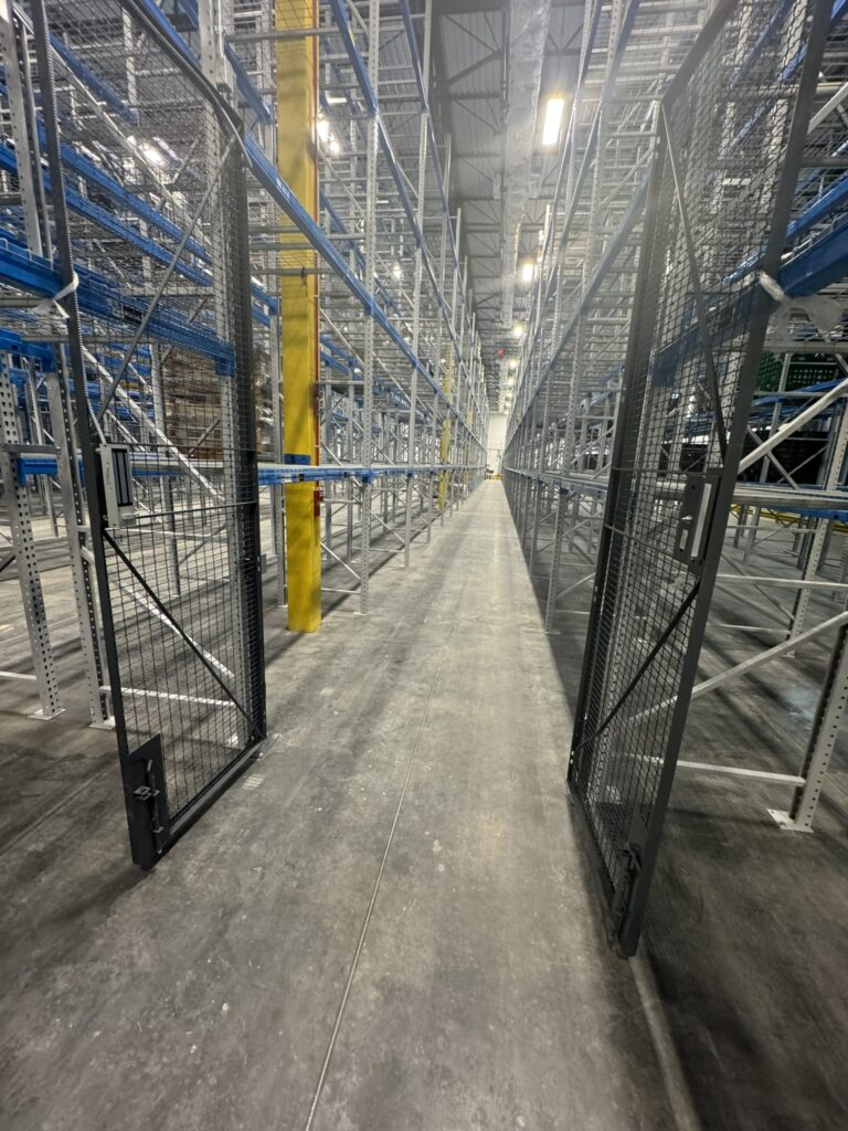 The customer needed a way to designate specific aisles within their warehouse to restrict access to high-value or sensitive pharmaceutical products. Because the facility operates with turret trucks, any solution had to maintain a minimal footprint and avoid adding unnecessary rack depth. They required a secure, clean, and efficient barrier that would not interfere with equipment maneuverability. To meet these constraints, the application incorporated double-swing cage doors that tie directly into the rack posts, creating a streamlined profile. The system also integrated WireCrafters mag-locks to provide controlled, keypad-based entry, ensuring only authorized personnel could access the protected aisles.