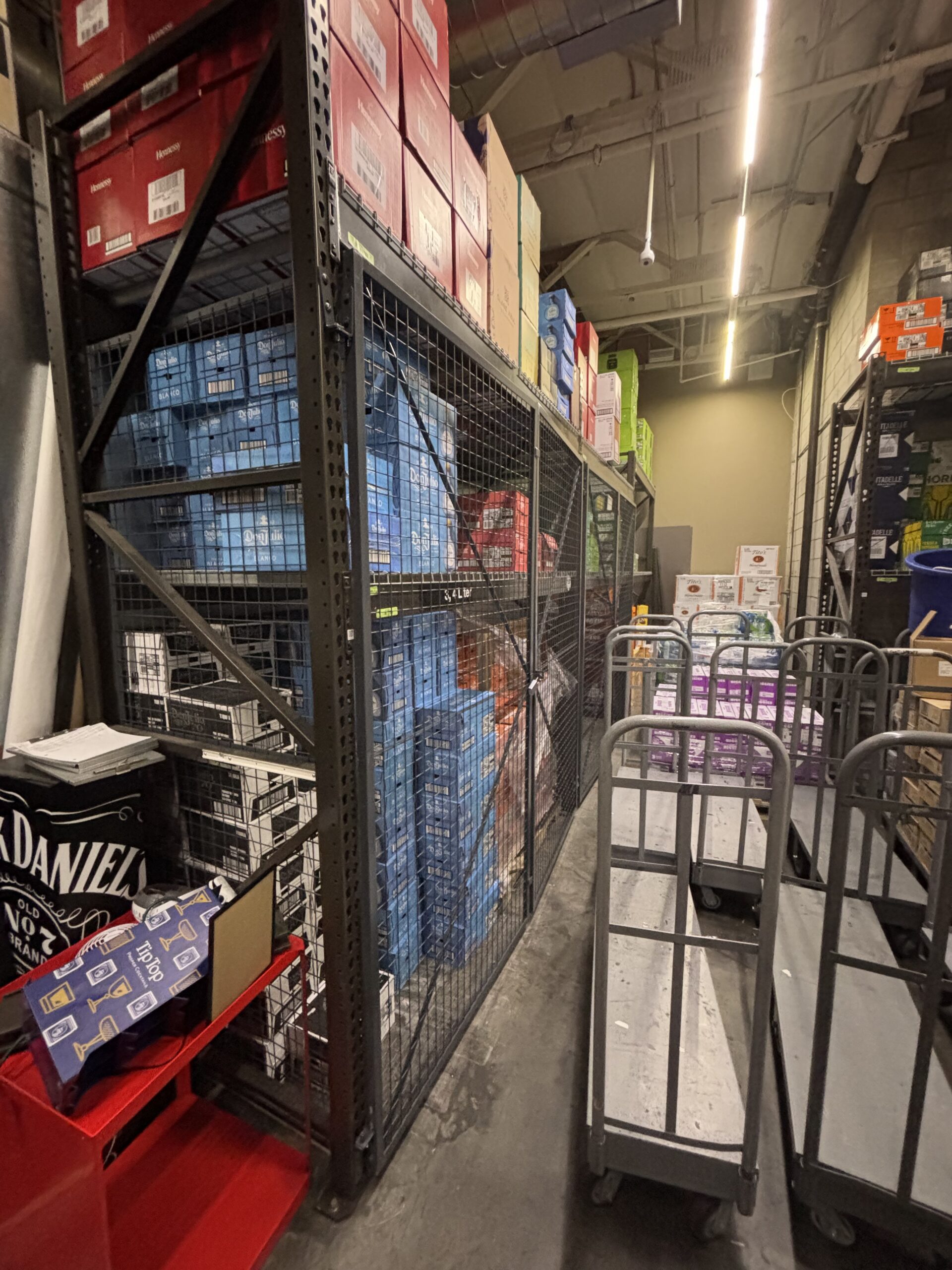 Total Wine identified a need to protect high-dollar wine, spirits, and beer temporarily stored in back-of-house areas while awaiting placement on the sales floor. These products are often staged on pallet racks in storage rooms, creating a risk for internal loss if not adequately secured. To address this challenge, most locations required a rack enclosure covering two bays of pallet rack, providing a physical barrier around the stored inventory. The enclosures offered a practical way to keep valuable products secure until they were ready to be moved to the retail floor, while still allowing straightforward access through a customer-provided padlock when restocking was needed.